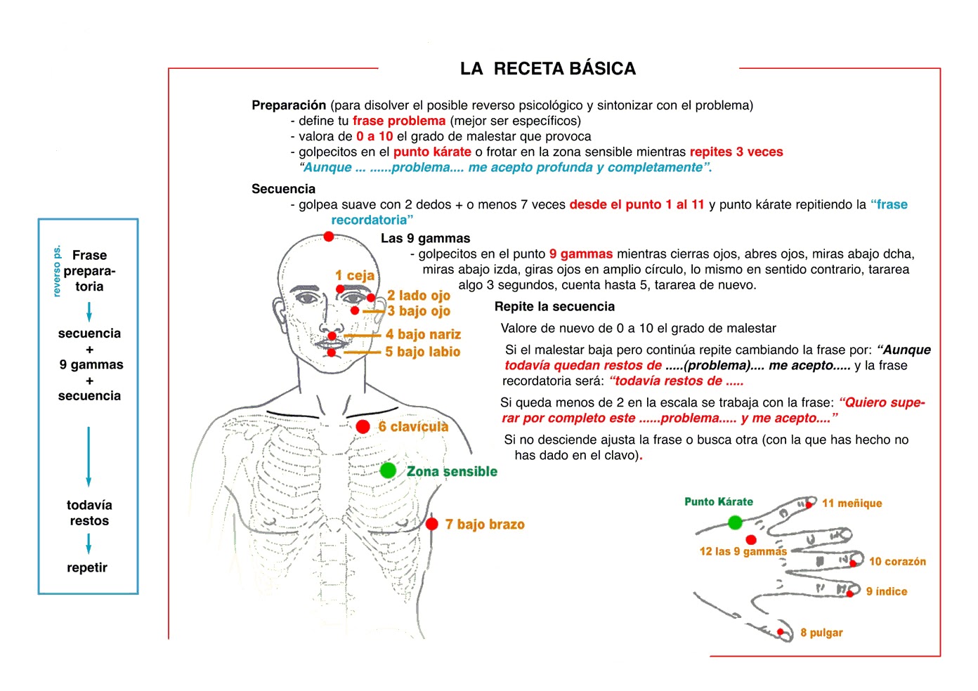 Comenzamos con el primer punto, que es el punto kárate, es el que trabajamos en la fase de preparación. Este punto corresponde al meridiano del intestino delgado, al hacer tapping en ese punto desbloqueamos este meridiano para que fluya la energía vital y se pueda liberar la emoción negativa correspondiente, en este caso libramos las dudas personales, los dilemas y mejoramos la autoconfianza.